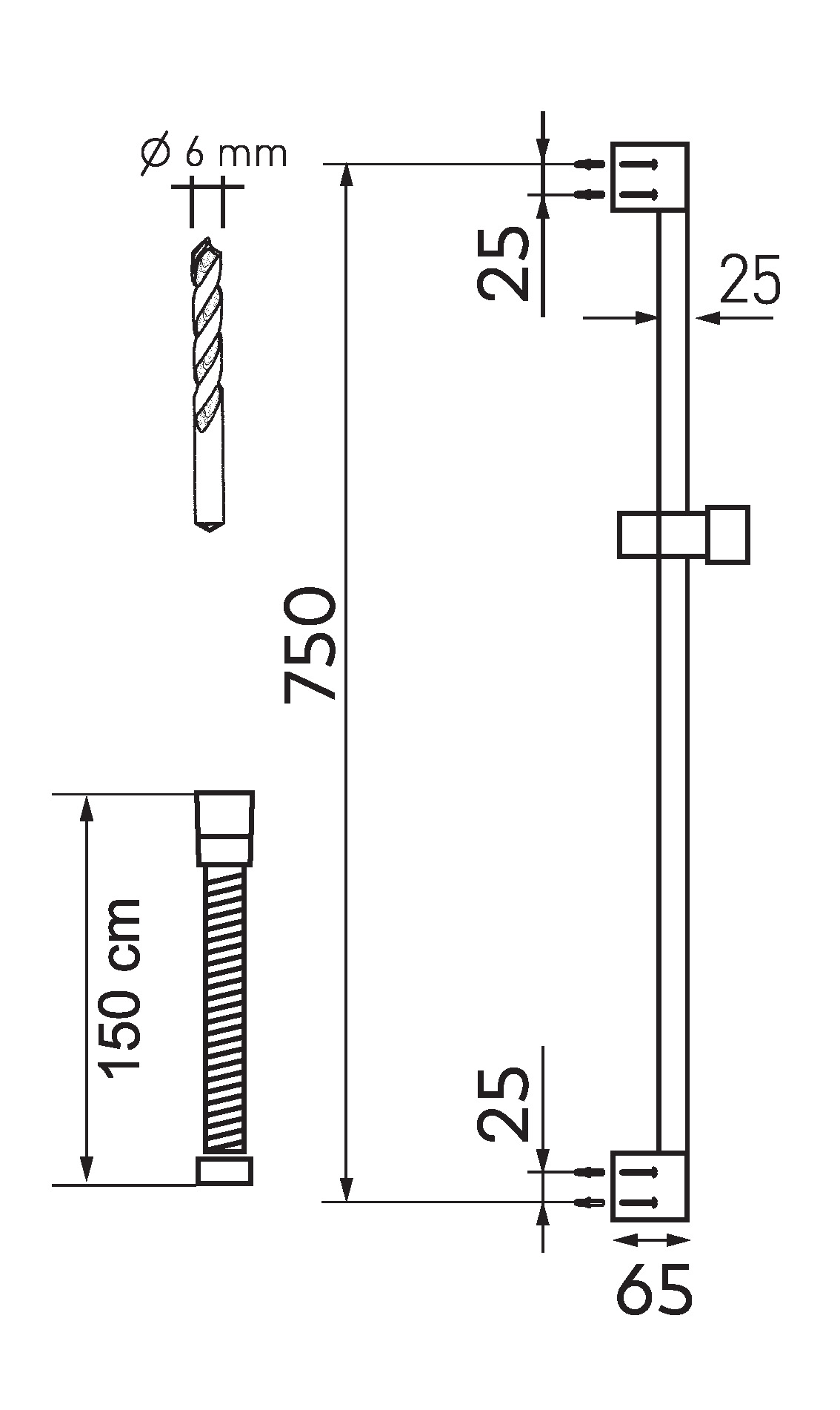 Sprchová súprava pre sprchové batérie obsahuje 3-polohovú ručnú sprchu s průtokem max vody 6 l/min,, posuvný držiak sprchy s dĺžkou 780 mm a kovovú sprchovú hadicu s anti-twist systémom s dĺžkou 150 cm.